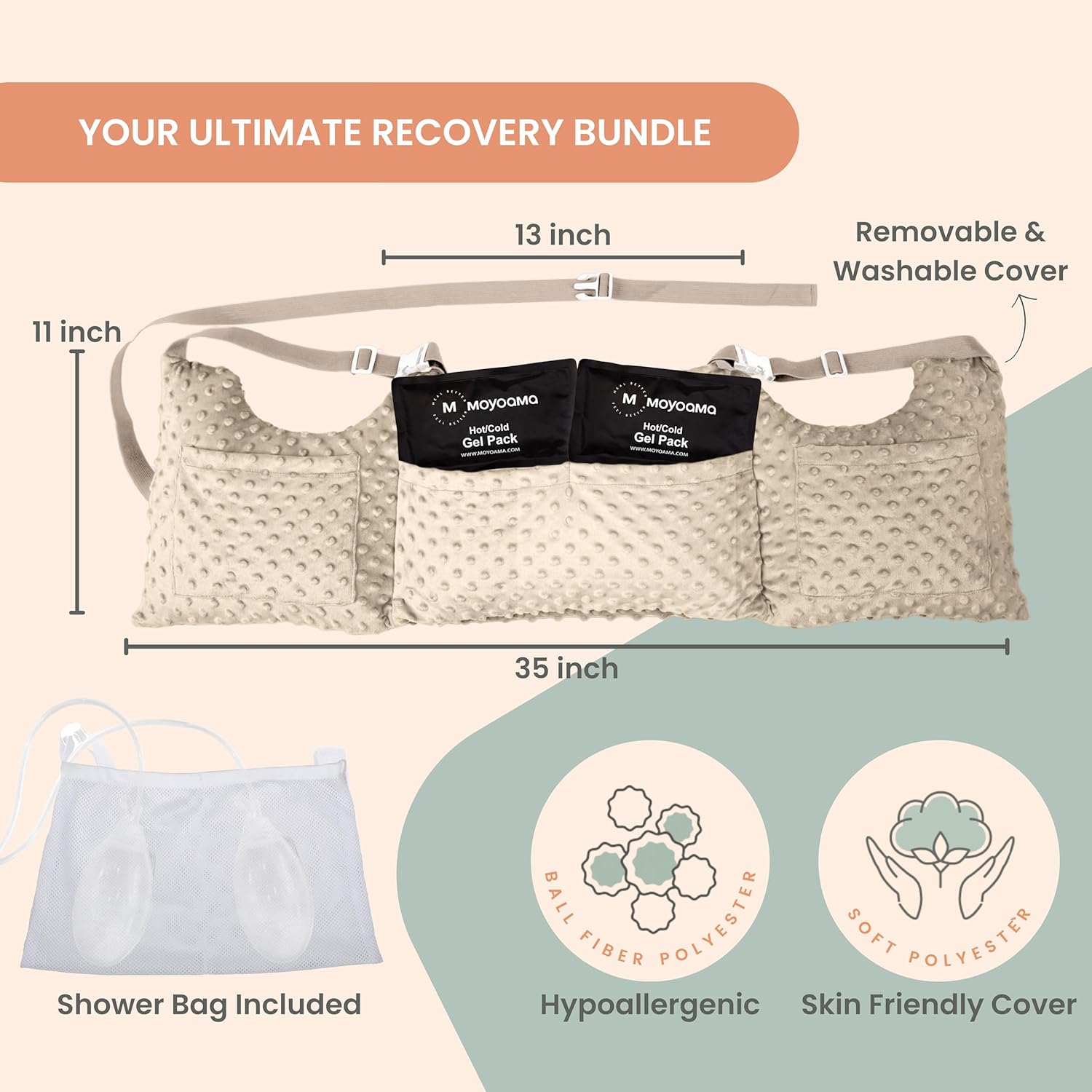 Adjustable straps help keep the pillow securely in place, eliminating the need to constantly reposition it as you move. Integrated side pockets keep small essentials like your phone or tissues within easy reach, adding convenience throughout the day. Each detail is thoughtfully designed to make daily recovery feel a little easier and more manageable.